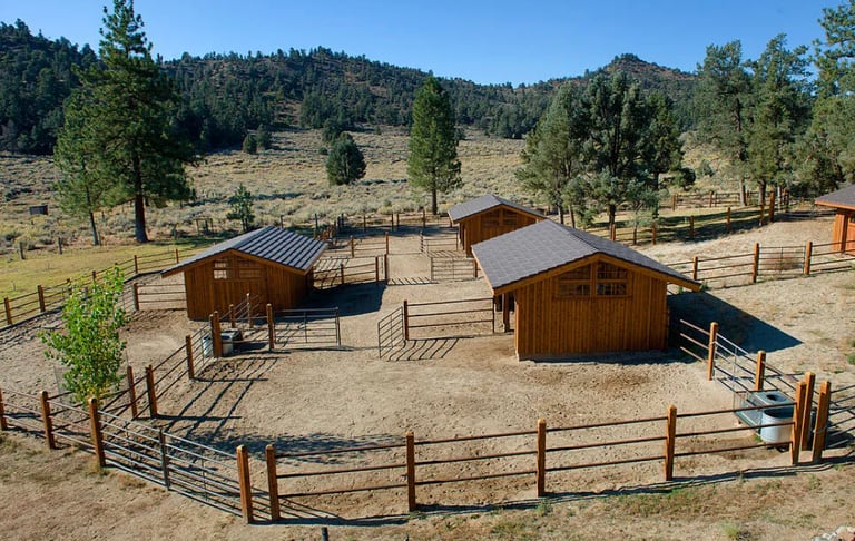 Multiple auxiliary barns and fenced pastures ready for horses or livestock.