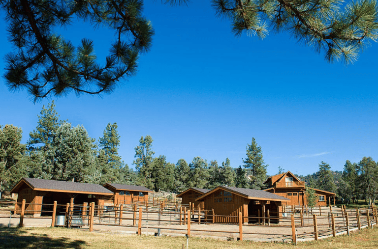 A main barn with stalls, tack rooms, and hay/equipment storage.
