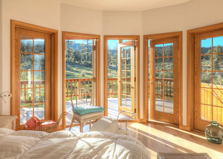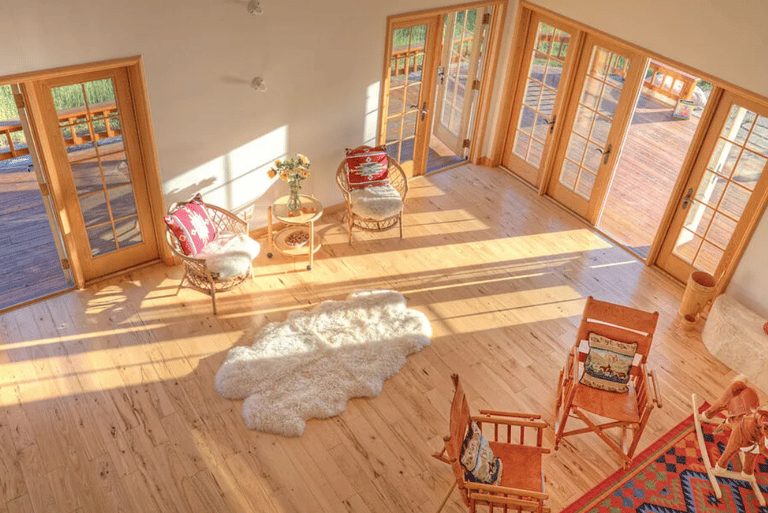 Grand two-story living room with 12 French doors that frame sweeping mountain and valley views.