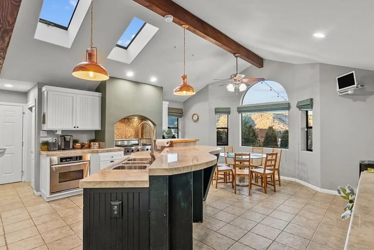 Step inside to discover a bright and open floor plan with vaulted ceilings, a cozy wood-burning stove, and large windows that flood the space with natural light. The kitchen features updated appliances and generous counter space, while the primary suite offers a private retreat with a walk-in closet and en suite bathroom.