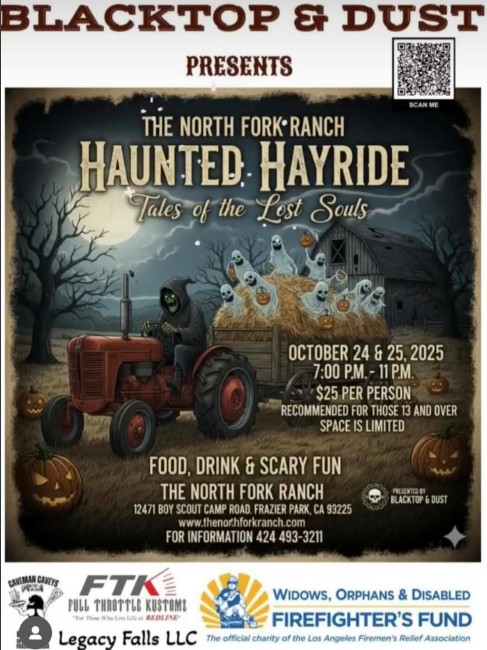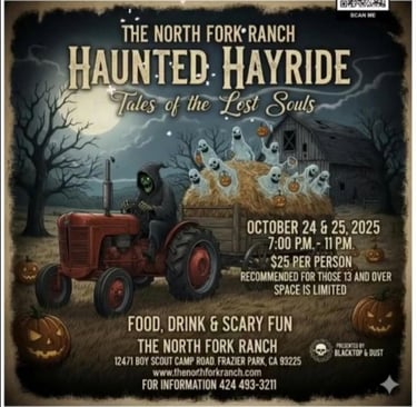 Prepare for a night of frights and thrills surrounded by nature — the Tales of the Lost Souls Haunted Hayride returns to North Fork Ranch for October 24 & 25, 2025, from 7:00 PM to 11:00 PM. Tickets are $25 per person, so reserve yours now: northforkrance.ticketspice.com/tales-of-the-lost-souls-haunted-hayride.